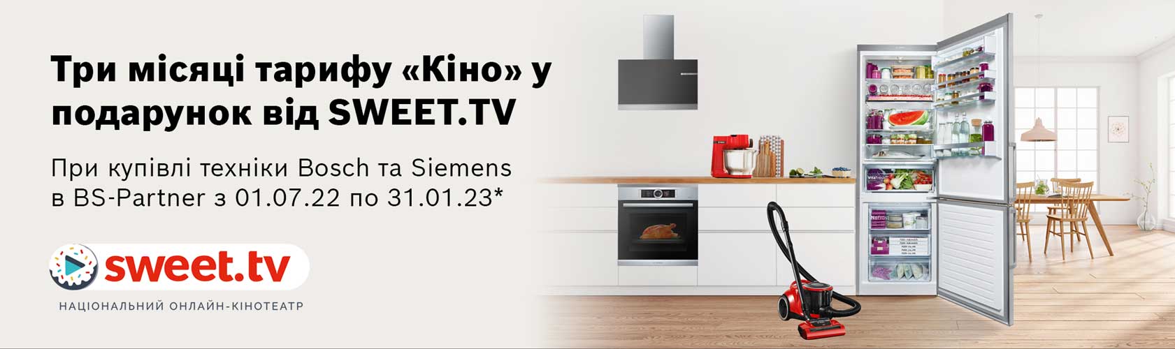 ⇒З 01.07.22 по 31.01.23 при купівлі побутової техніки Bosch та Siemens у мережі магазинів BS Partner отримайте подарунковий промокод на 3 місяці тарифу "Кіно" від SWEET.TV