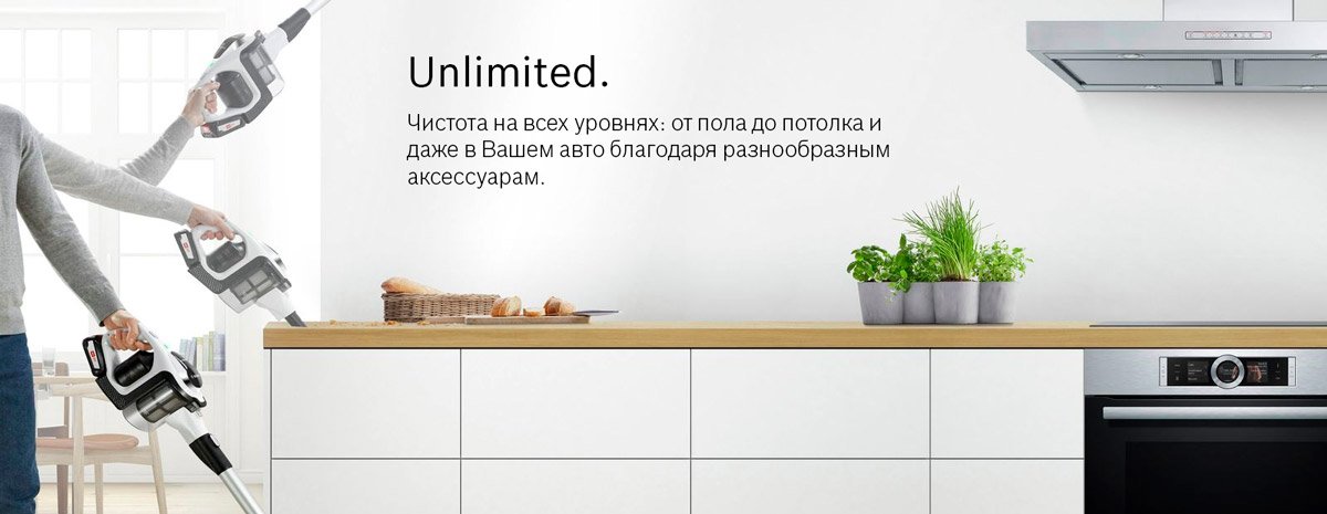 Нарешті Вам не знадобляться різні прилади для прибирання в різних частинах Вашого будинку. Вже сьогодні Ви можете ефективно прибирати на всіх рівнях. У комплекті нового акумуляторного пилососа Unlimited є корисні аксесуари, які стануть в нагоді при догляді за будь-яким типом покриття підлоги: плитка, паркет або ламінат, а також килими, корпусні меблі, оббивка м'яких меблів і навіть стеля.